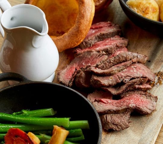 Each roast is served with crisp roast potatoes, honey-glazed parsnips, Yorkshire puddings, seasonal greens, and rich gravy.