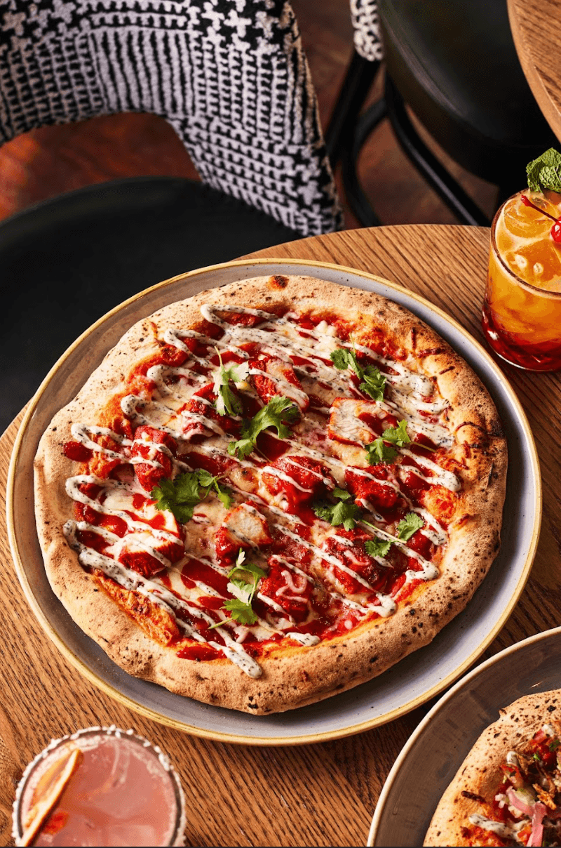Tandoori Chicken Pizza – Stone-baked pizza with tandoori chicken, PEPPADEW® pepper sauce, mint mayo, and coriander.